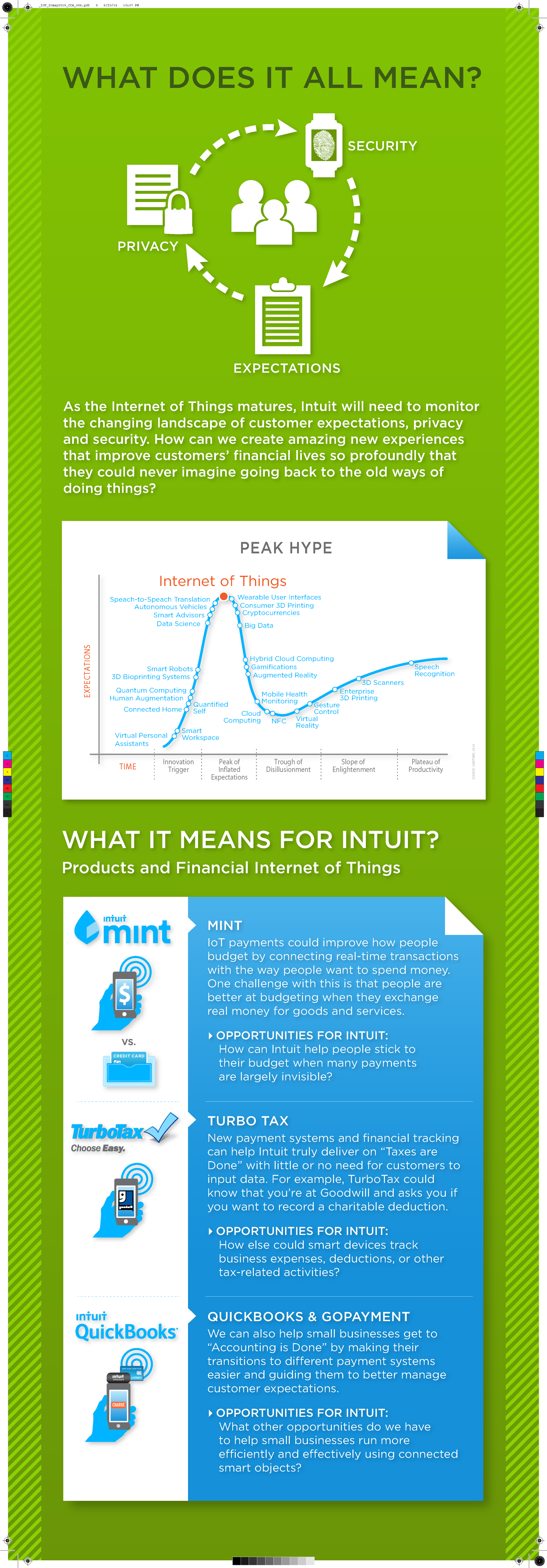 NEXT Day is an internal event at Intuit to educate employees about new and emerging technology as well as inspire them to look for the next big shifts in the industry. In May 2015, I co-wrote the content for the NEXT Day exhibit on the Internet of Things. This included descriptions of its potential to change the technology industry in general as well as possible implications for Intuit's customers and Intuit products. Partnering with Percolate, we created the following posters to display in the event space.
